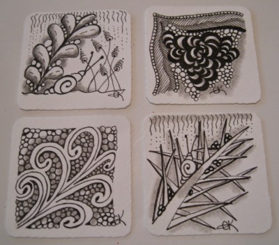 I really love doing these. I will often draw Bijou on several tiles in different positions with my dip pen, and after they dry I tangle him into someplace. I love that these have given me the impetus to try some tangles I don’t normally use as well.