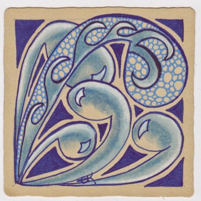 I got out this week’s Diva Challenge #181, with the theme of Water. I went to the beach yesterday, and it was rather soothing listening to the sound of the waves crashing. I hope you can see some watery-ness in my Mooka.  Signo UM-153 pen in blue, Signo Angellic in light blue, and General’s Chalk Pastels (white, light blue and indigo) on Renaissance Tan tile.