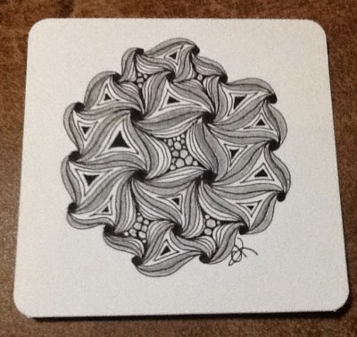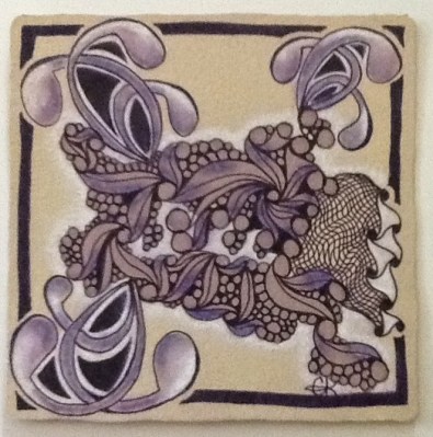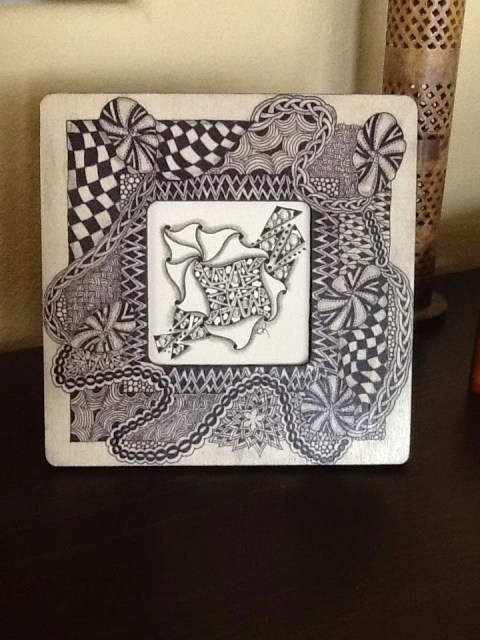 So with that being said, I’ve made a lot of effort on a few projects that required minimal mental effort. I am almost done “up cycling” our dart board case (icky old Miller Lite thing,)  which, of course, I had to add some tangles to. I’ll post the finished product next week.