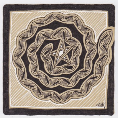 I was in the CZT class (14) where ING was introduced, and I have been tearING up a log of my tanglING ever since. I decided to take a slightly different approach this time, and made my zig zag curvy, and spiraled it out. Of course I am still on my “black on tan” period, so that played into it as well. And that little Auraknot in the middle? it just  happened. I think its rather plain, but bold, it has a beat, and I can dance to it.