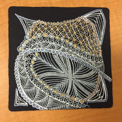 I did so the Blind String last week (#187) but I gave it to someone that admired it in class, so I forgot to post it…so here that is. Black tile with all the metallic Gelly Rolls I could grab at the moment.