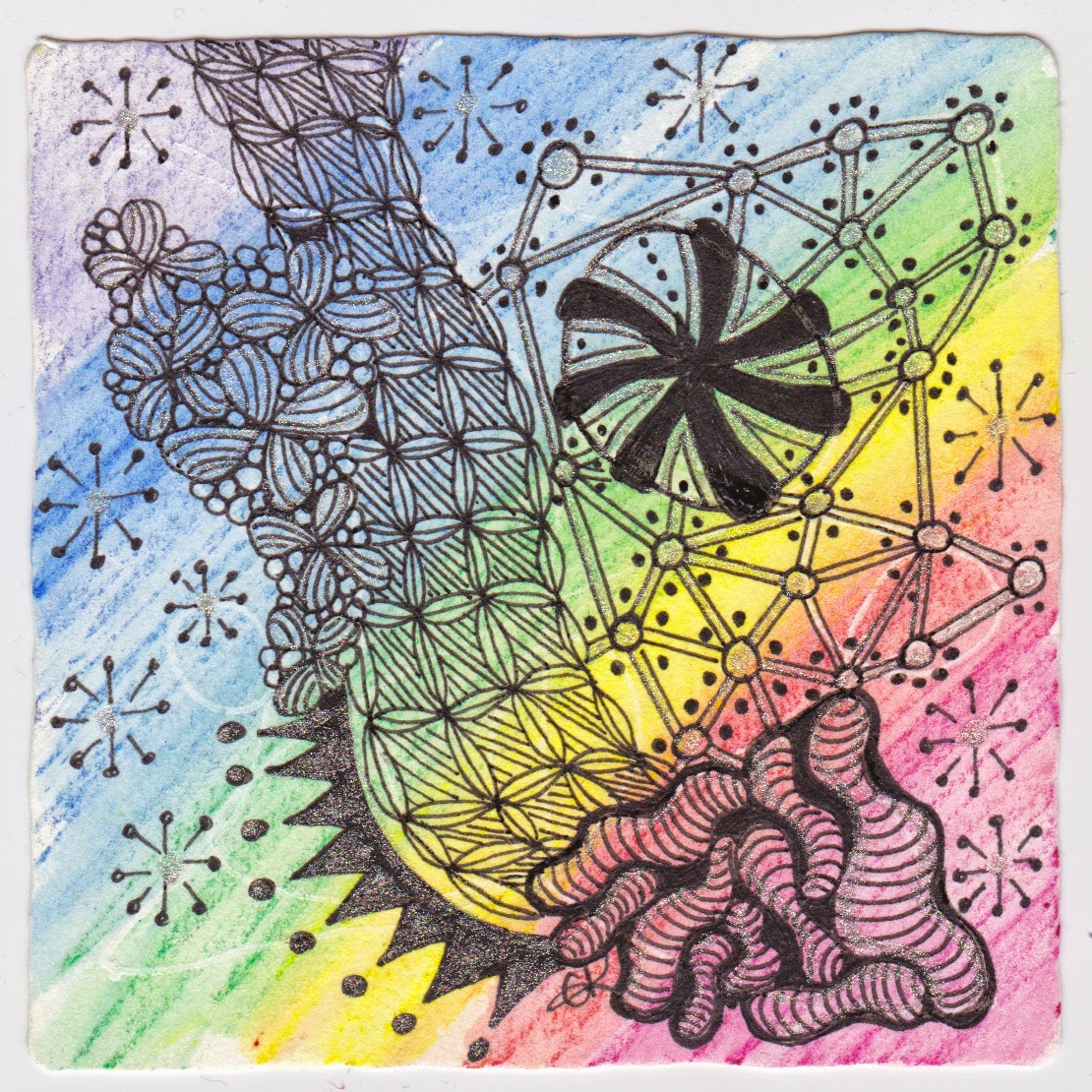 And on to #188…This one I really lamented over. To have a 12 year old who is so aware of the world and the inequities in it, is really amazing. So it is to him, and all my friends and family in the LBGTQA community that I dedicate this tile (if you don’t recognize that last bit, it’s Queer and Ally, and I also added a C tangle to my tile for myself!)  I wish the scan would show how sparkly it is!