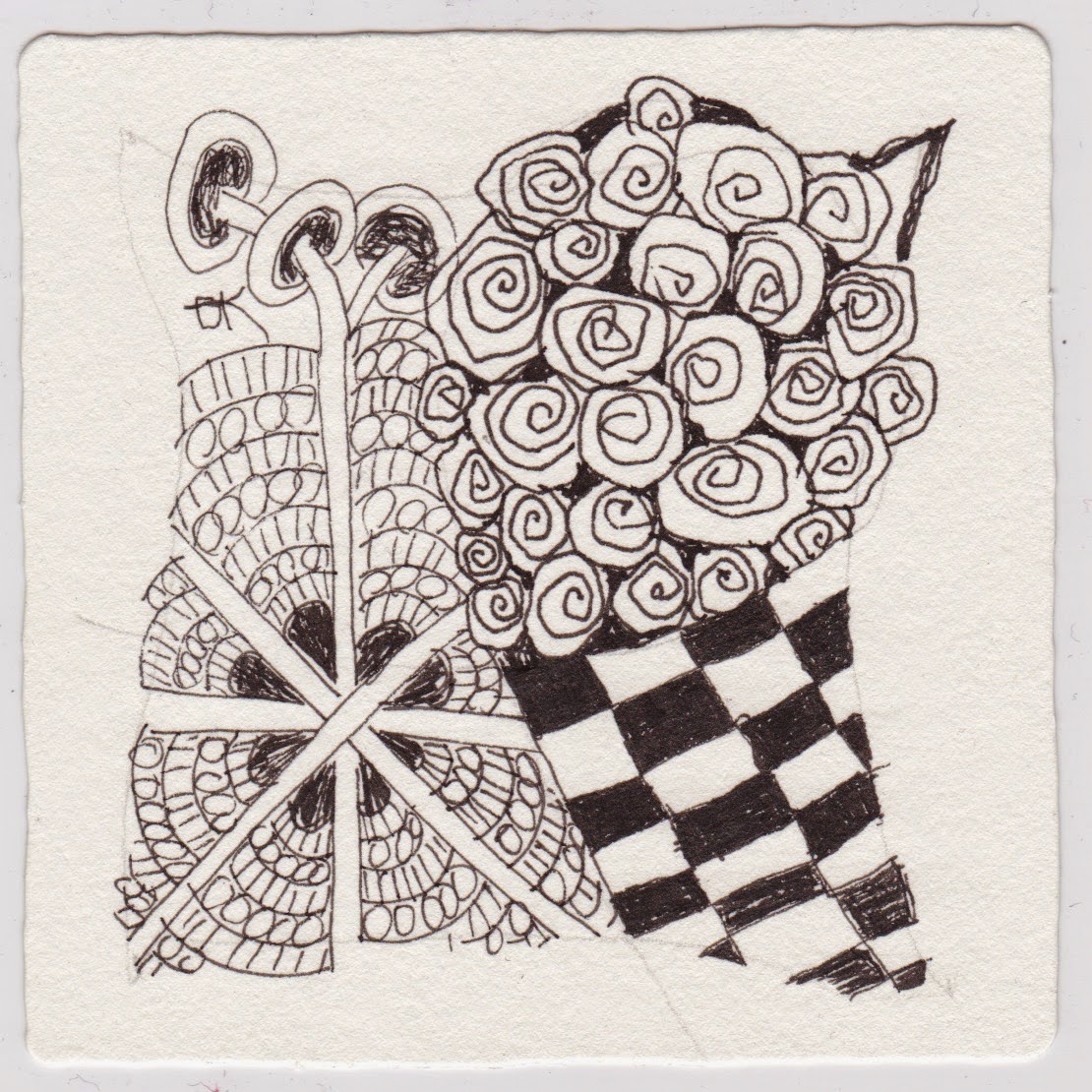 So to make this week a real challenge, here is a throwback Diva from when I was being a bit of a slacker. This one was #194, entitled “Embrace the Yuck.” The prompt was to go outside your comfort zone and do a tangle with your non-dominant hand. I’m right handed. I may as well only have one arm, because my left does not do what I want it to do. I procrastinated on this one really bad for a while, because it made me very uncomfortable. I did part of it with my left hand, and part of it with my glasses off (which just made my eyes water and gave me a headache…)