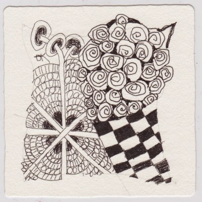 This week, our darling Diva asked us to do a DuoTangle of Chebucto and Copada by Margaret Bremner. Now, for those that know me, I’m not squeamish, and I don’t practice, I just do. I have to say this one was a major trial for me (resulting in a couple of ripped up tiles in the trash!) I love Margaret, but I was calling her all kinds of names…and kinda lost my Zen. But on a last resort, I pulled out one of my old “practice tiles” and I think I came up with something workable. I was really getting back into it in the end. (Thankfully, that silver pen is opaque and covers up a bunch of things!)