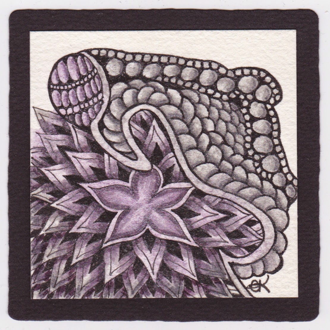 So…I reverted to something else I figured as a semi-failed attempt a while back. I watercolored a few errant pieces of water color paper with the salt process and some cool Niji pearlescent watercolors, and when they were done, I didn’t know what to do with them. They were so pretty, they intimidated me. So, I whipped out the least intimidating one (purple and grey) and the associated Tombows, and tangled away. I just got my Tombow markers recently, and haven’t really used them much, and I have never really shaded with color, so this was a grand experiment.
