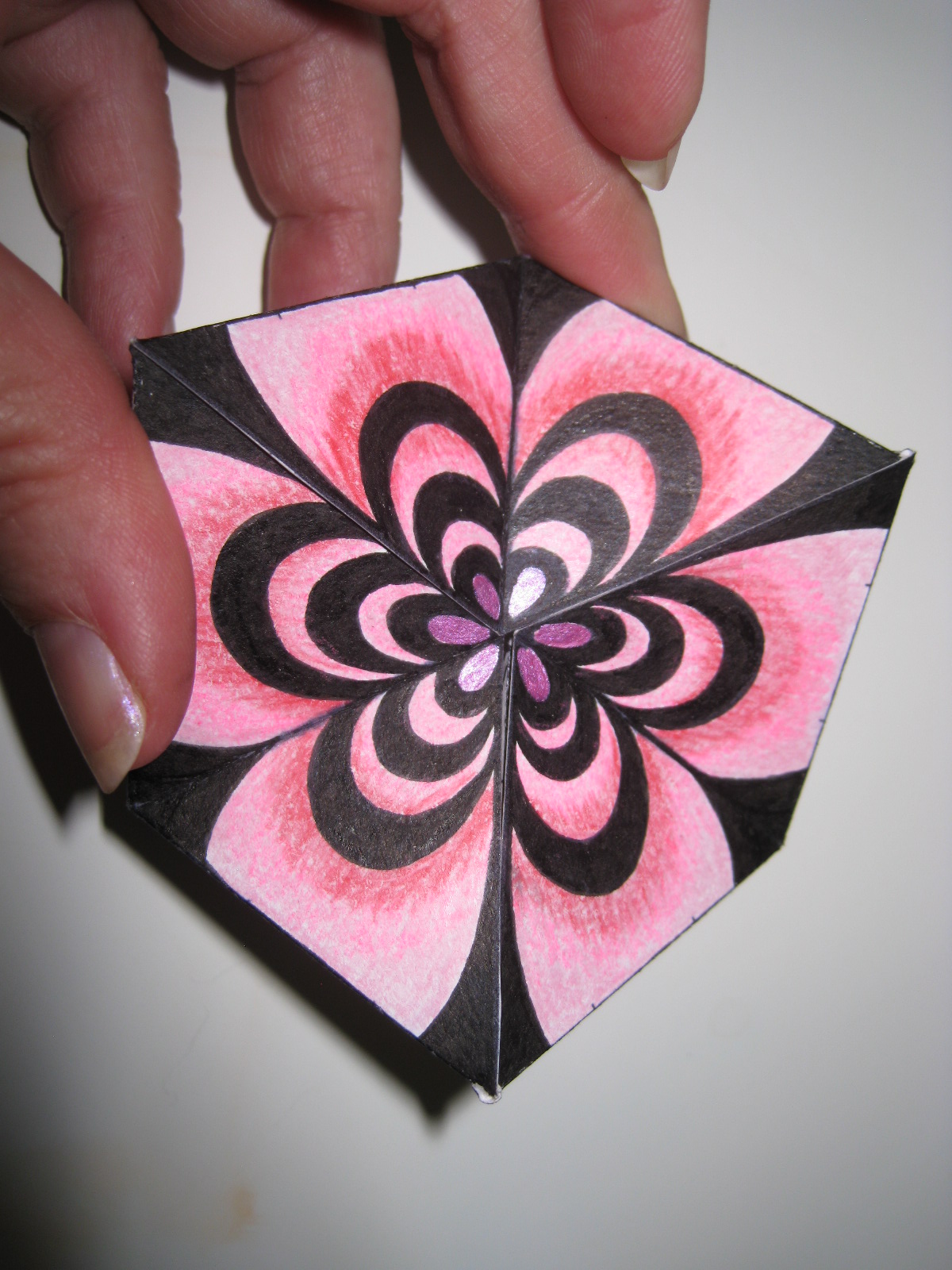 If you are feeling adventurous…you can get the template here. If you are going to tangle on it, I highly recommend you use a mixed media paper (I used the Canson XL Mixed Media, cut to 8.5×11 and printed on my inkjet.) I tangled with regular Micron (I used an 05 to speed things up a bit) and Irojiten colored pencils…and a little metallic Gelly Roll. (Gotta have some sparkle!) There are some tricks to getting the folds right…and getting the tabs to stick inside. You can see it in action on this video (sorry, I haven’t gotten the hang of videoing myself yet.)