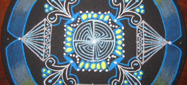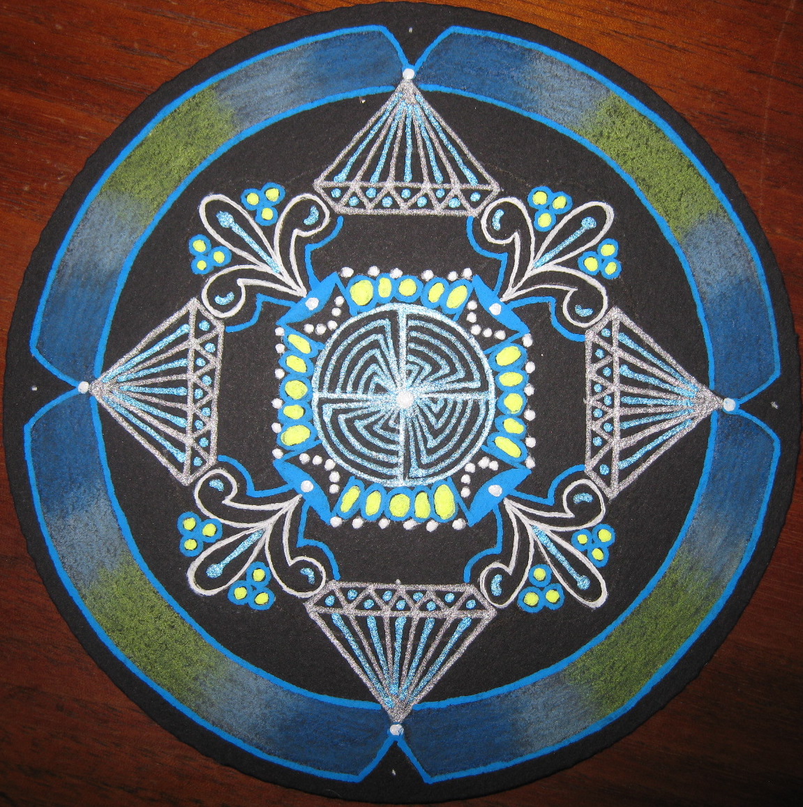 So I figured it out today as well. I started the tile for this weeks’ Diva Challenge (#222) on Monday, and promptly got “art block.” The prompt was Colours of the Rainbow and I wanted to finish another of my already strung Zendala tiles from TangleU, and I really like color on black, so I grabbed that one. Now last week, I had no problem at all throwing all kinds of color in my tile. But this week, I was stumped! I did eventually get into it, and then I started thinking I needed to keep adding to it. But ya know what? It’s Done. Enough. I like it how it is and I think if I keep OCDing on it, it will detract. But…alas, the Stardust pens (the black light ones) don’t scan in their color that well, so this week I had to photograph it.