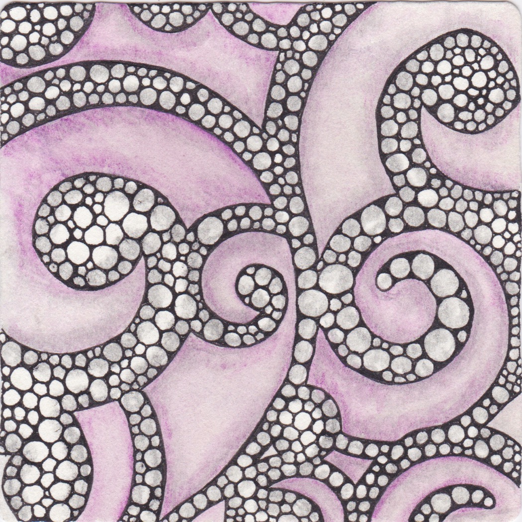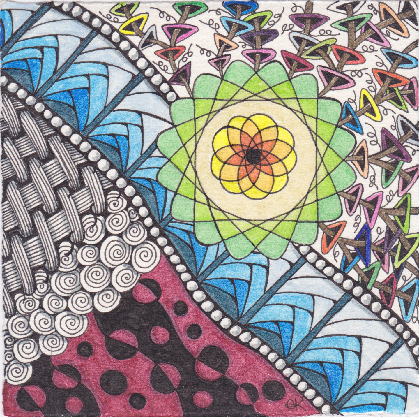 Part of the ongoing circus this week was our annual trip to Rock Fest (in Cadott, Wisconsin.) I am still recovering from that! I did tangle while I was there, and finished a previous Diva Challenge (#224 – Tipple Monotangle.) This was one of my dyed tiles using Hibiscus Tea, but you will hear more about those when I Guest Blog the Diva in September!