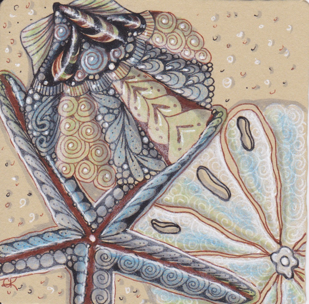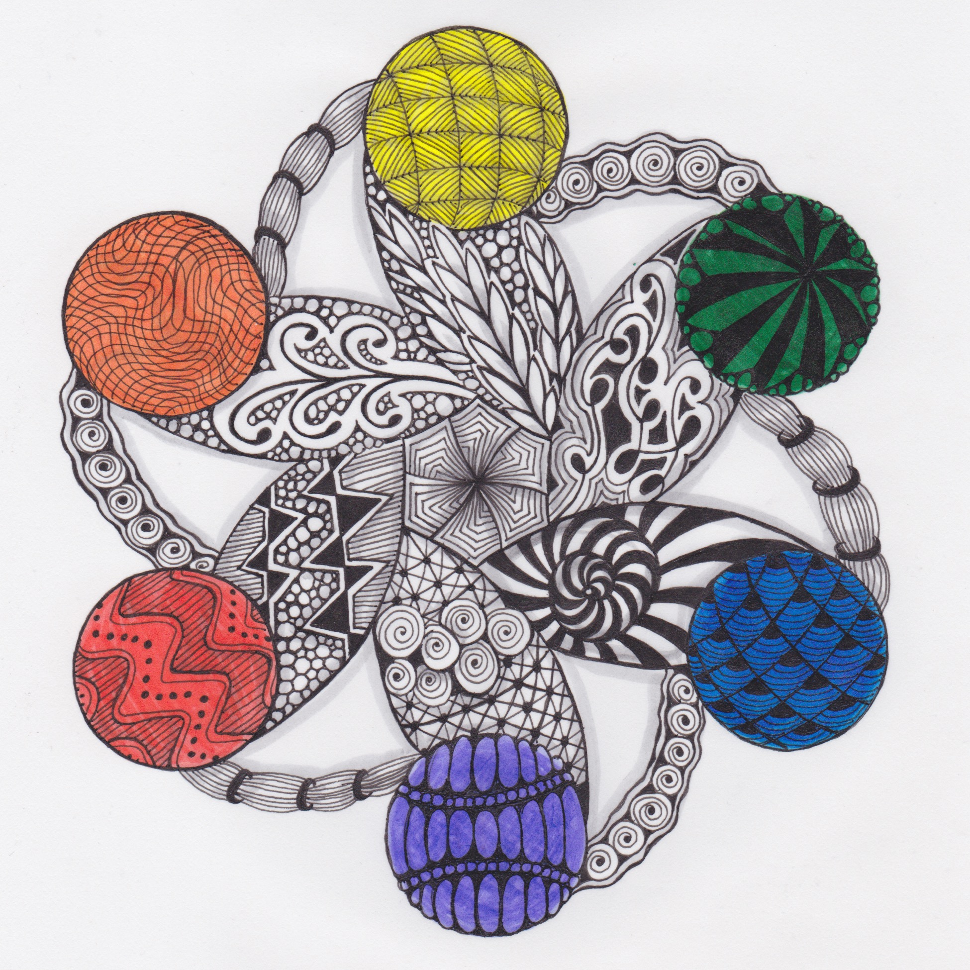 On the PDF from Bright Owl, there were a tile size, a zendala size, and the one I used, which is about 6 1/2″. I forgot to mention that all the tangles I used started with the same letter as the color area they are in…:-)