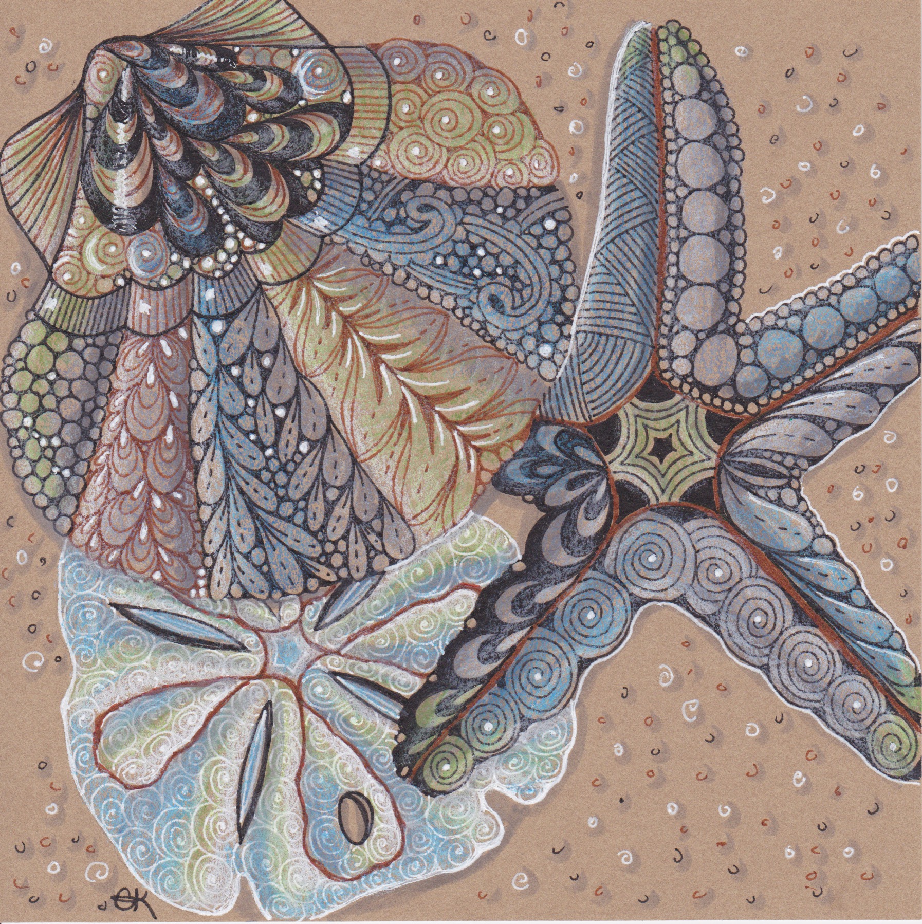 And then I decided I needed to go a little bigger, and try some different paper. This one is on Stonehenge Kraft (6″ sq) – which is available in my etsy store (or you can email me at CharKatTangles at gmail.com to get some.)