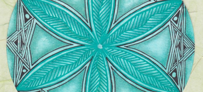 But, I digress from what brings you here! This week’s Diva Challenge (#279) was a Duotangle featuring Meer and Auraknot. It did take me a couple of days to get my head wrapped around this, because I could only see it the same way I think everyone else saw it…but you know me, I had to be different. So I grabbed a dyed tile, and my compass (gasp!) and put in the basic flowers shape. I thought I would monochrome it, but it was looking really bland, so I went back in with the black Micron and finished it. Shaded with a chalk pastel.