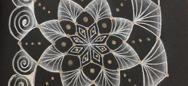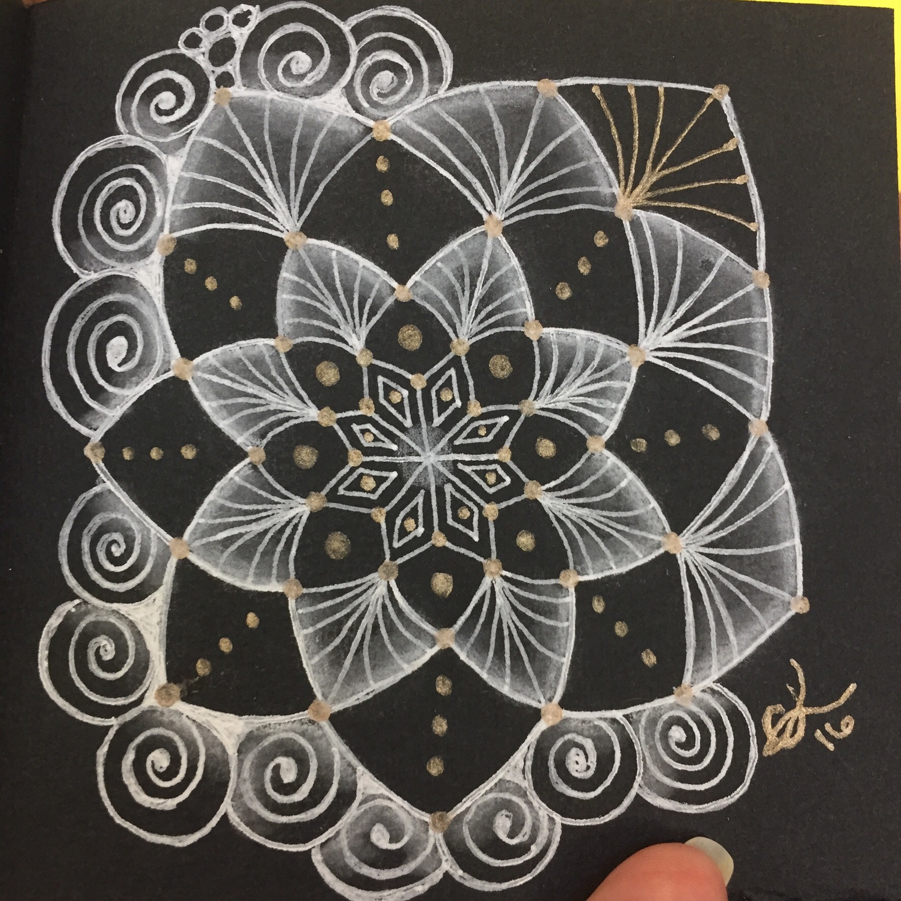 Filled with beautiful black paper! So this weeks Use My Tangle (UMT) is from Daniel Lamothe CZT, and he provided us with a tangle/reticula called Dreamcatcher. I think it is a lovely idea, and decided to keep it a little simple in my new journal. (It is just under 4″, so perfect Zentangle size!) White and Gold Gelly Roll, and White Chalk Pastel pencil.