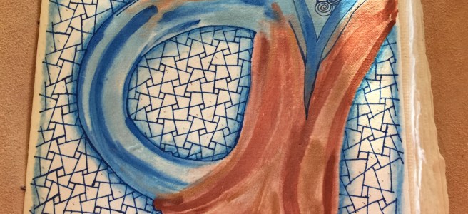 What brought a lot of this to mind is this weeks’s Diva Challenge (#292) which was a Use My Tangle called Eaxy by Nadine Roller, CZT. It was not the tangle so much, as the medium I chose to complete it in. On my trip to Venice, I purchased several hand made journals, so I selected one of them to work in. It is a lovely red leather with hand made paper, sewn in small signatures.