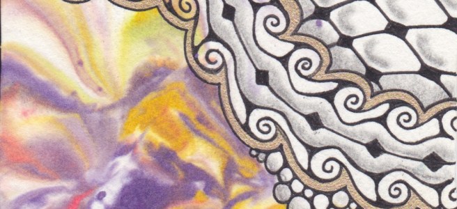 Or…this weeks Use My Tangle (UMT) by Lily Moon for the Diva Challenge (#306.) It is a pretty cool tangle, with lots of potential. The tile I used was marbled in shaving foam by my friend and fellow CZT, Annette Carlo. It was too pretty to tangle over the marbly parts, so I left part of it original.