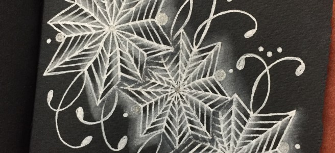 Since I am basking in the afterglow of having a nice workspace again, it is only right that this week’s Diva Challenge (#344) is a Use My Tangle (UMT) of Afterglo by Carole Ohl, CZT. I have not done this tangle since my very first month tangling, and I did not have fond memories of it. So trying it again (I am still on the white pen kick in my black Venice Journal) I kept an open mind.