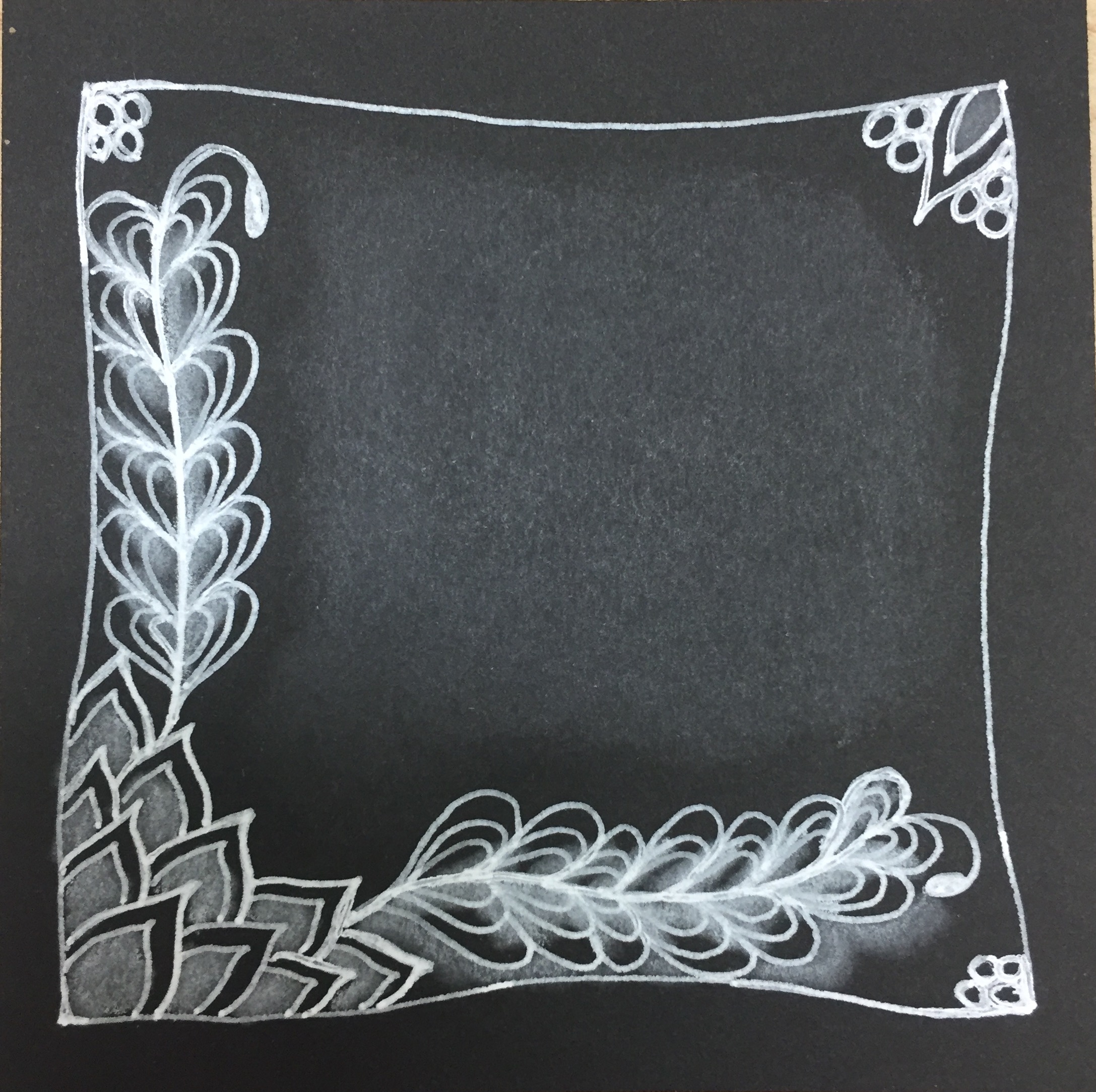 It just so happened to coincide with me seeing a really cool ZenGem done in just white on a black tile, so I decided to use a black Zendala so I could try it out. I used only a white Gelly Roll, white Chalk Pencil, black 01 Micron, and some silver relief paint.